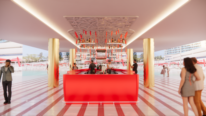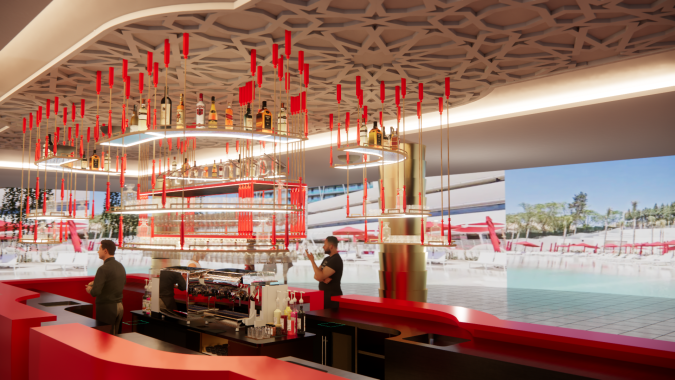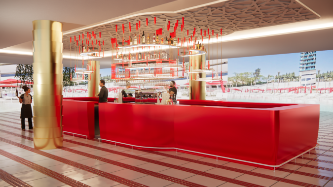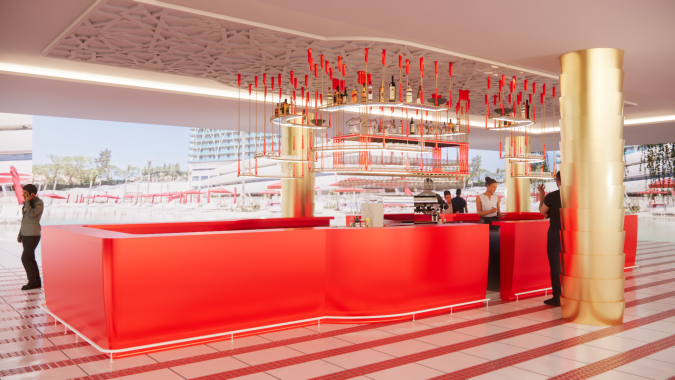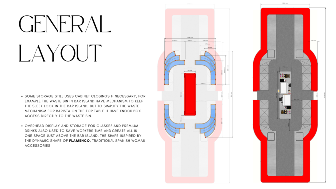 Inspired by flamenco and Spanish accessories, the bar island’s dynamic form blends fluid design with practicality, creating a vibrant yet efficient space for both staff and guests.