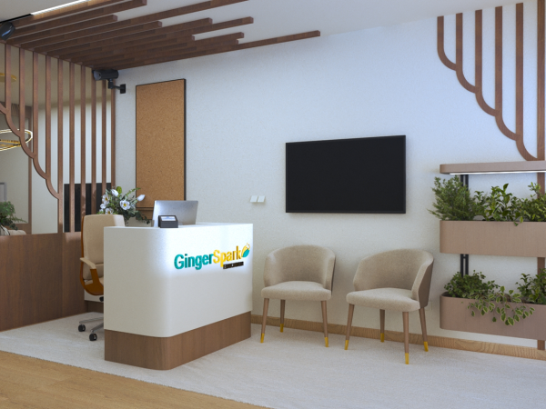 A dynamic mix of earthy neutrals, cheerful pops of color, and tactile materials creates an inviting yet contemporary vibe. A signature tree has been designed as a symbol for Ginger Spark future expansion.