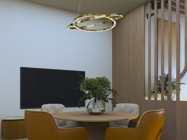 The design emphasizes a modern, flexible space with sleek lines, visual connection using glass partitions and a designed ceiling lighting. Each square meter is used, creating zoning to cater to various activities.
